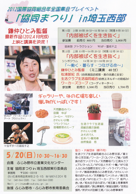 共同まつりも開催されて、催し物もいっぱいなので、映画を観て、鎌仲ひとみ監督に会いに行きましょう。