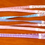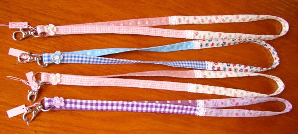 高瀬さんの、「手作り小物教室」では、いろいろな手作りを体験できます。 「ネックストラップ ¥800」 店頭で¥630で販売中。 「カフェエプロン ¥1800」 「リバーシブルのバック ¥1200」 「バネ口のポーチ ¥850」等。