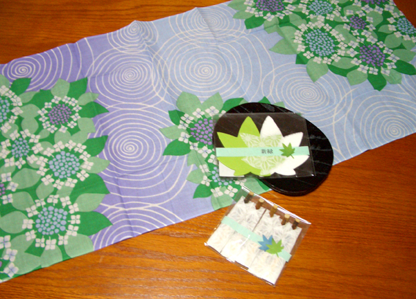 きれいな 「紫陽花の手拭い ¥1050」 入荷しました。 緑が鮮やかな 「楓の敷き紙 ¥472」 「楓の楊枝 ¥420」 「木の豆皿 ¥1050」