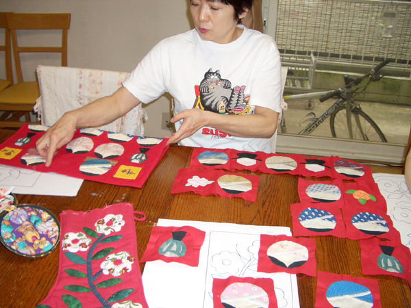 新人ながら、「ひな祭り」タペの、大作に挑戦。 だいぶん出来上がってきました。 鈴木先生が、パーツを点検します。