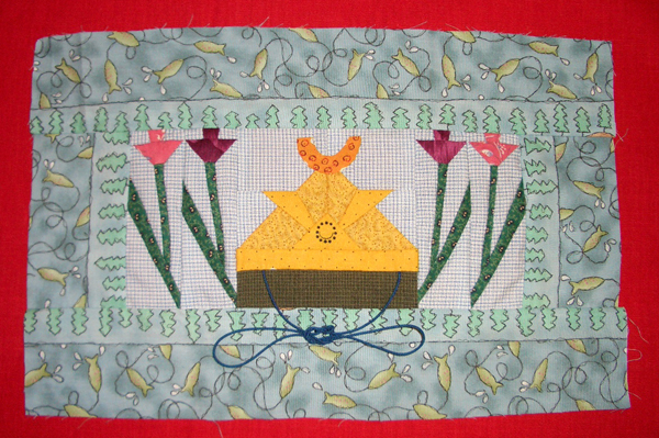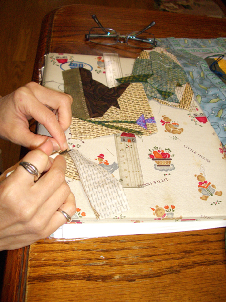 ただ今、「兜」 作成中の大原さん。 細かいパターンが、かなり込み入っていて、混乱中。 ほどいて、縫い直します。 (@_@;)