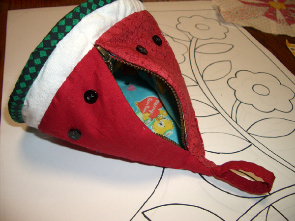 柳下さんの、すいかのポーチが、出来ました。 内側が、メリーポンポンの生地になっていて、可愛いです。