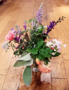 お客様にいただいた、お庭の花束。 いろんな種類のお花と一緒にハーブが入っていて、素敵な香りが・・・。 1cm位のおちびなカマキリも混ざっていて、睨まれました。