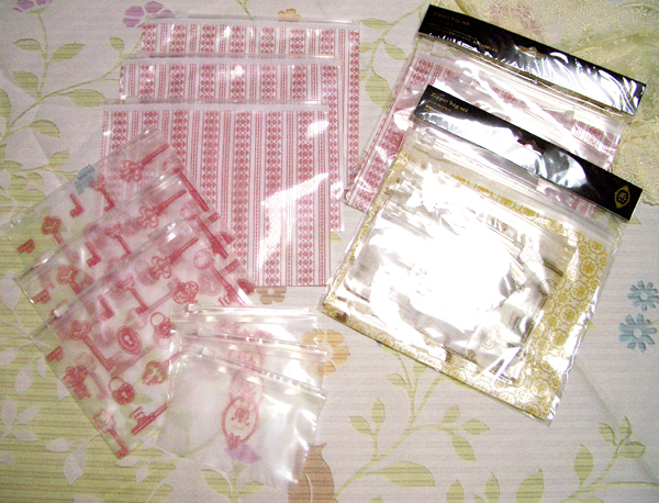 品切れ中だった、アンティークな柄の 「ジッパーチャックセット ¥483」 入荷しました。 ピンクとゴールドです。 お出掛けに便利。