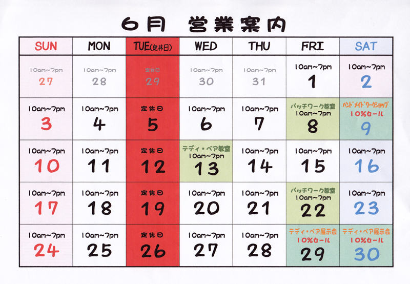 「ハンドメイドワークショップ」 6月9日(土) 10AM~4PM みんなで楽しく手芸会 店内全品10%オフセール