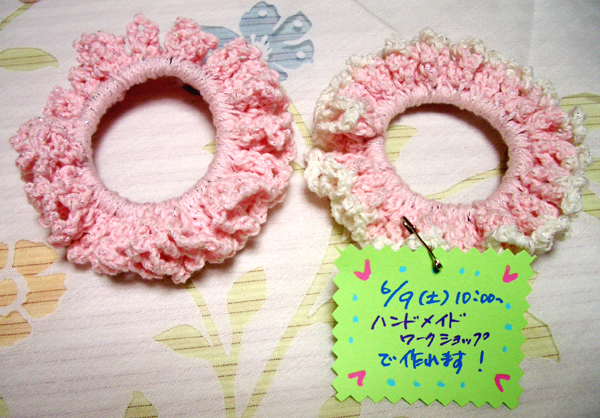 nacyu hana(鼻和)さんの教室では、「シュシュ ¥500」 も、作れます。 可愛いコースターも、500円で作れます。 作品も販売しています。 nacyu hanaさんの教室は、都合で13時で終わりますので、作りたい方は早めに来て下さいね。(予約可)