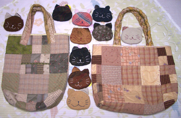 和布地の小物が人気の、三瓶さん。 楽しい 「猫の小銭入れ ¥630」 を作りました。 手縫いならでは、全部、猫の表情が違います。 大きい 「パッチワークのバック」は、¥2940 と ¥3150 で、お買い得です。