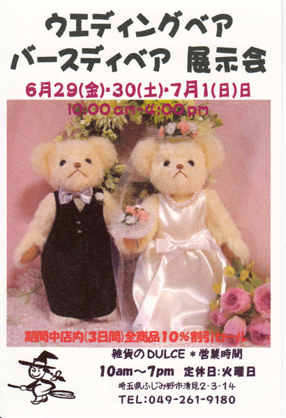 の、お知らせDM、お出ししました。 展示会で記名頂いた方に、お出ししていますので、いらした方はご記名下さいね。 3日間、先生もいらっしゃいますので、テディ・ベアを作ってみたい方、ご相談をお受けします。 ウエディングベア、バースディベアの、ご注文もお受けします。