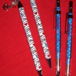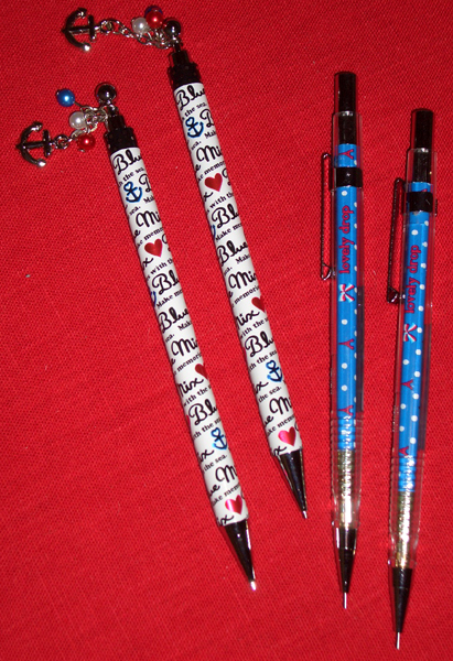 シャーペン 「いかりのチャームが付いた、マリンなシャーペン ¥367」 「エッフェル・りぼん・水玉の青いシャーペン ¥210」