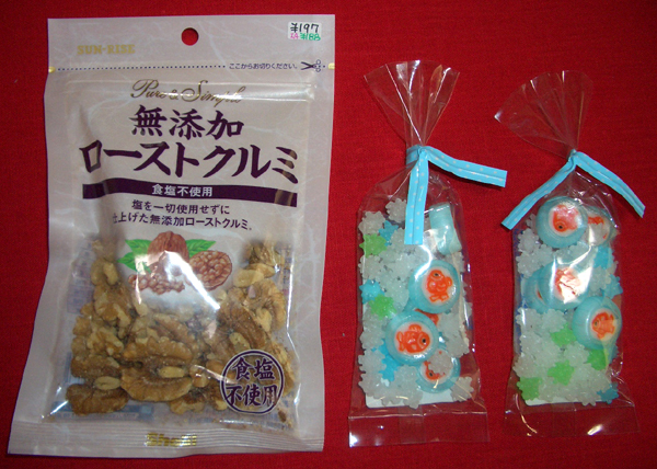 ご要望のあった、「無添加ローストクルミ ¥197」 食塩不使用です。 最近ナッツ類は、人気です。 金平糖の中に、金魚の飴が入った、「きんとと飴 ¥210」