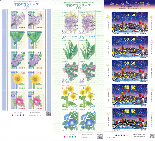 新しい切手、出ました。 「季節の花シリーズ 第3集」 50円と80円があります。 「ふるさとの祭」