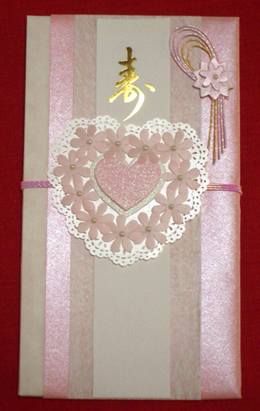 キラキラのハートにレースが付いたピンクの 「金封 ¥472」 ご結婚祝いに内包み、一筆箋付きです。