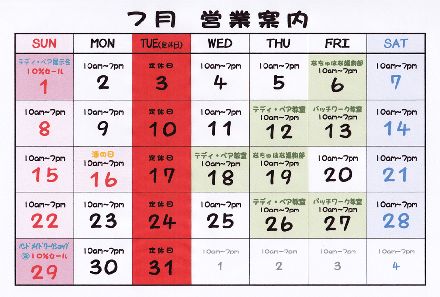 「ハンドメイドワークショップ ②」 7月29日(日) 10AM~4PM みんなで楽しく手芸会 店内全品10%オフセール