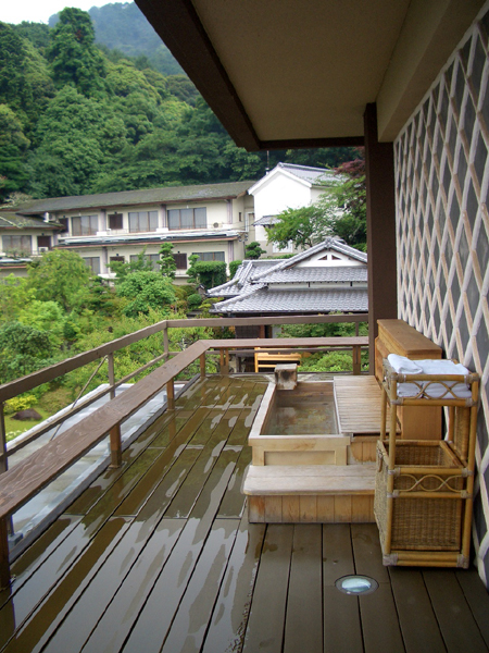 夜は100km位走って香川まで行き 待望の温泉だわぁ。 「琴平花壇」 に宿泊。 リニューアルの新館はかなり贅沢で、中庭には足風呂、部屋には露天風呂(テレビ付き)あります。