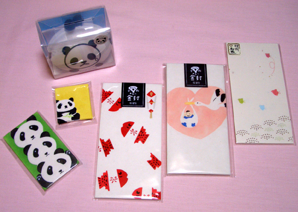 どうしても欲しくなって買ってしまう金封 手すきの和紙に手彫り版で味のある羅製シリーズ 3枚入り 「パンダ コイン用 ¥472」 「重ねパンダ柄 ¥525」 「たい、こうのとり ¥525」 使いやすい柄の和紙祝儀袋 4枚入り 「千鳥 ¥315」