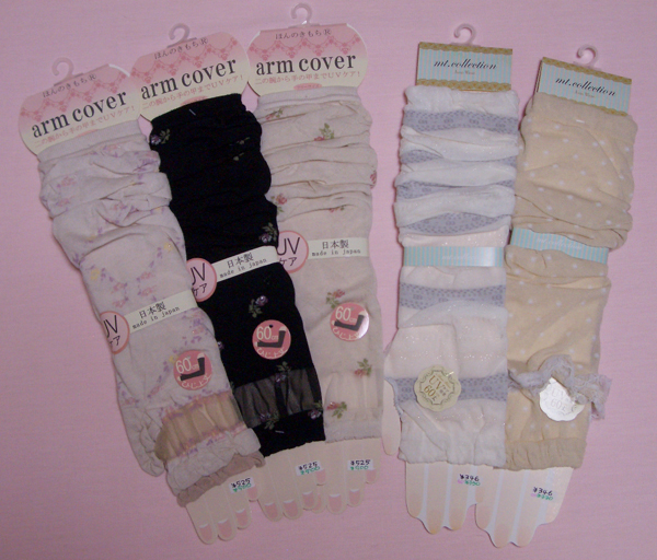 大好評のアームカバー ひじ上丈の60cm長いタイプ ¥368と¥525の2種類。 夏のUVケアの必需品です。