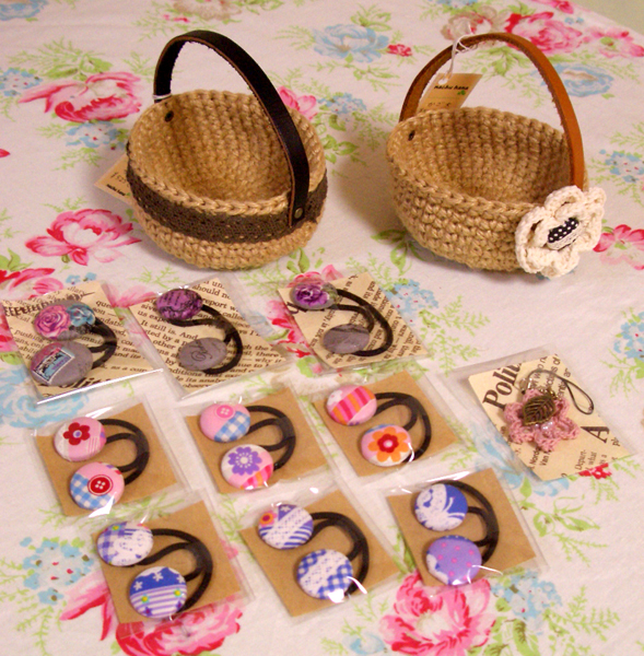 nachu hanaさん、くるみボタンにはまりました。 「くるみボタンの髪ゴム ¥105」 持ち手がリッチな革製 「かご ¥525」 おまけに作った、「お花のストラップ ¥315」