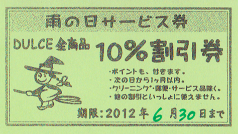 雨の日には、お買物時に 「雨の日サービス券」を、お渡ししています。 期間は、次の日から1ヶ月。 全品10%割引になります。 雨の日にお渡ししていますが、雨が降っていない日も使えます。