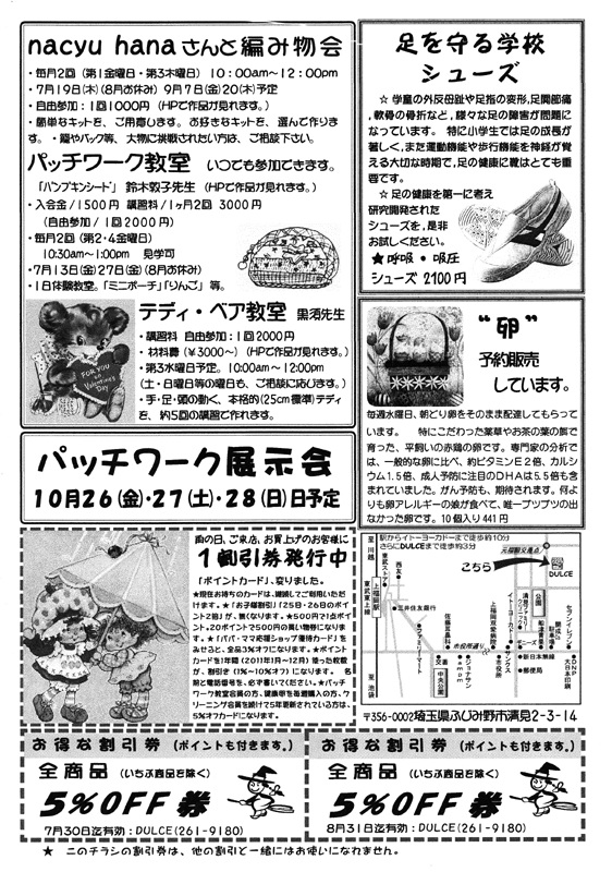 「手作りバサーと手芸会」 7月29日(日) 10AM~4PM みんなで楽しくバザーと手芸会を開く予定です。 手作り作品、手芸品のバザーと、手作り教室(小物作り、アクセサリー作り、デコ盛り体験等)が、親子でも楽しめるたのしいイベントです。 お店も、全品10%オフセール。