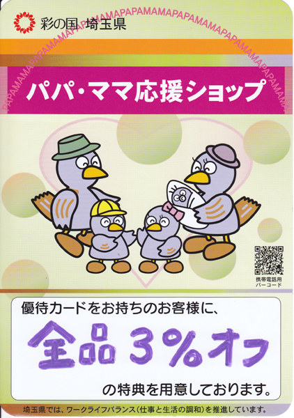 そして、DULCEは 「パパ・ママ応援ショップ」 です。 カードを見せて頂くと、いつでも全品3%オフに。 (切手・クリーニング等一部商品を除く。) 忘れた方は、子どもを見せてもOKです。