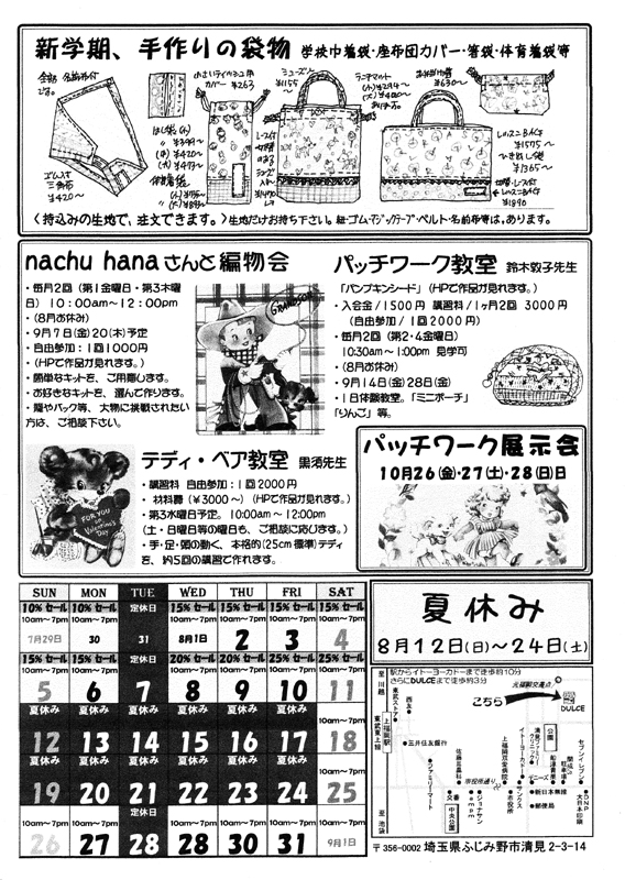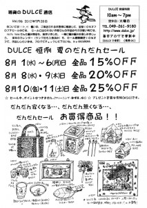 DULCE通信 Vol.196 出来ました。 8月12日(日)~8月24日(金) 夏休みで、お休みします。 8月18日(土)のみ、営業します。