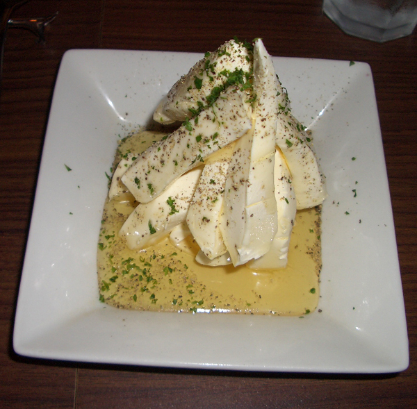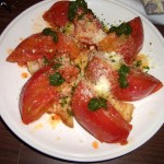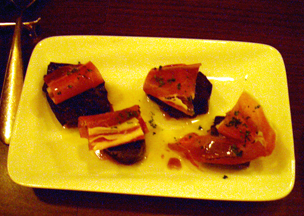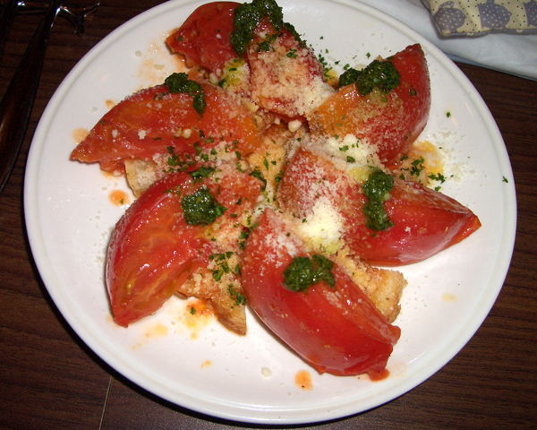 「丸まる1個使った焼きトマトのプルスケッタ」と、「クリームチーズの黒こしょうとハチミツがけ」に、「ひよこ豆とソーセージのピリ辛チリビーンズ」・・・。