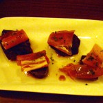 楽しみにしていた、評判のワンコインバル 「リゾットカレースタンダード」 。 地下1F、カウンターだけ18席位のちいさなお店です。 全面禁煙で、お店の人もすがすがしい応対で、活気があって大◎です。 6時開店で、直ぐに満席。(予約しといて良かった。) 何より、食べ物も飲み物も、全品500円(税込525円)。 気楽にどんどん頼んじゃいます。 まずは「ナスのバルサミコマリネ生ハムのせ」と、「たっぷりお肉のせオリジナルポテトサラダ」