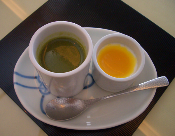 白ゴマのお豆腐、うまうま。 ジュンサイの入ったコーンスープは、ちょっと甘くてジュンサイの食感も涼やか。 ひとつひとつ小さなお釜で炊き上げたご飯は、柔らかくておいしいくて、幸せです。 がっつりお肉も頂いて、お腹いっぱいです。 デザートは、抹茶のおしること、豆乳プリンマンゴーソースかけ。 手間のかかった和食は、心が洗われます。 ごちそうさま。