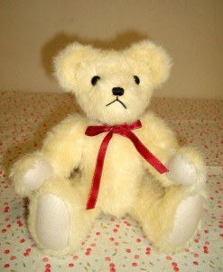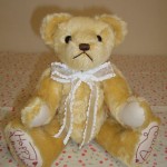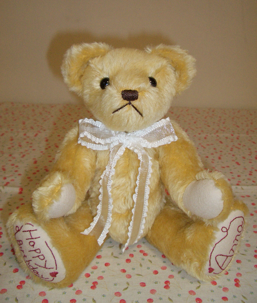 ご注文頂いていた、バースディベアも出来ました。 ひっくり返すと、「ウ~~ッ」と、鳴きます。 30cm ¥6300 ベアの足の裏に、お名前を刺繍してあります。 お誕生日の方が、喜んでくださると、嬉しいです。