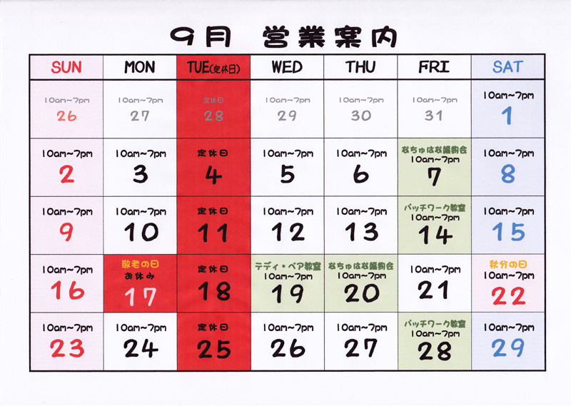 9月の営業案内 定休日 火曜日・(月曜日の)祝日 9月22日(土)秋分の日 祝日営業します。