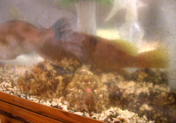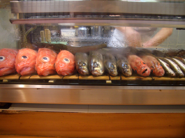 夜は予約しておいた、流川の小魚料理のお店 「とみ助」 に。 カウンターだけのこじんまりしたお店です。 目の前のお魚に睨まれます。 水槽の左側のオコゼを、食べちゃいます。