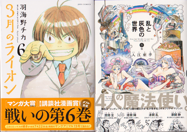 「3月のライオン 6」 羽海野チカ (いじめテーマは弱いので、泣いてしまいました。ううっつ。)と、「乱と灰色の世界 ③」入江亜季 (やっぱり魔法好きです)。 面白かった。 羽海野チカさんはちょっとファンで、「ハチミツとクローバー」も、全巻あります。 漫画を読み始めると、誰の声も聞こえなくなるので、家族に嫌がられます。