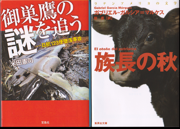 漫画で頭がリラックスしたので、なんだか読み終わらなかった文庫も一気に読めました。 「御巣鷹の謎を追うー日航123便墜落事故」 米田憲司 (680円払ったからには、最後まで読む。) 「族長の秋」 カブリエル・ガルシア=マルケス (ラテンアメリカの文学シリーズが文庫になったので、「蜘蛛女のキス」を久しぶりに読み返してみる。 昔書かれた本を読むのは、ノリが落ちると忍耐力がいりますが、840円払ったからには、最後まで読む。)