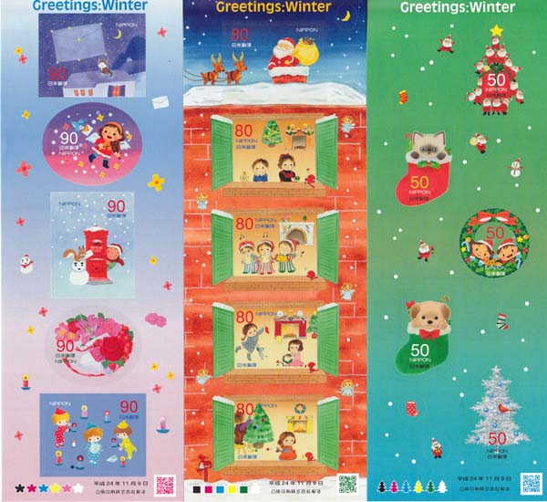 クリスマス柄が暖まる「冬のグリーティング」 250円・400円・450円の3種。 毎年待っていらっしゃる方も多く、人気の切手です。 プレゼントにも喜ばれます。
