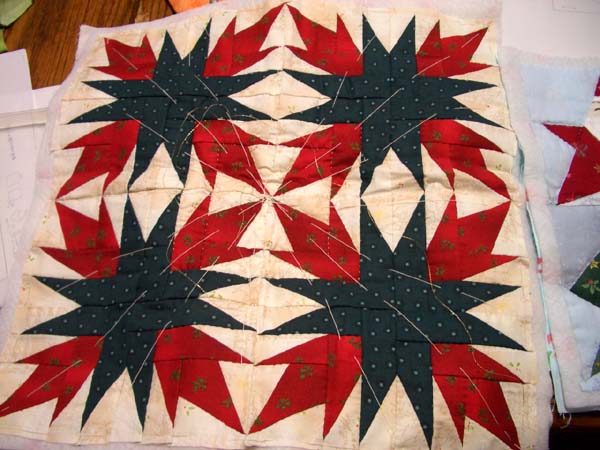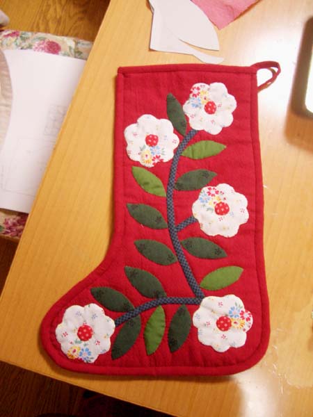 塚ちゃんは、やり残していたクリスマスのパターン2種。 ゴージャスな金糸と銀糸でキルトしています。 素敵です。