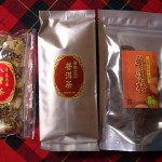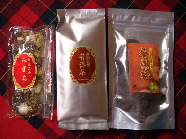 「八宝茶」甘くて美味しく暖まります、「プーアル茶」散茶なので淹れやすく、8年ものの軽めで飲みやすい、「餐後梅」甘くて大好物。