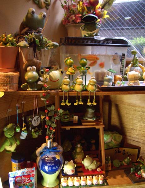 良く見ると、入口には、もっとカエルいっぱい。金魚もいて、かわいいです。