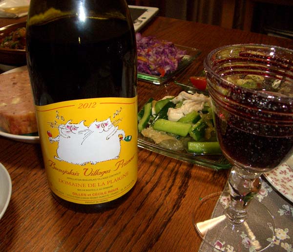 渋谷に用事があったので、東急デパチカで、お惣菜を買って、ワインを買って帰って夕食です。 ワイン売り場の前で立ち試飲してたら、隣で試飲の綺麗なお姉さんに勧められた「ドメーヌド・ラ・プレーニュ/ボージョレーヴィラージュ」。猫のラベルが可愛いので、お買い上げ。たしかに、当たりでした。お姉さんありがとう。
