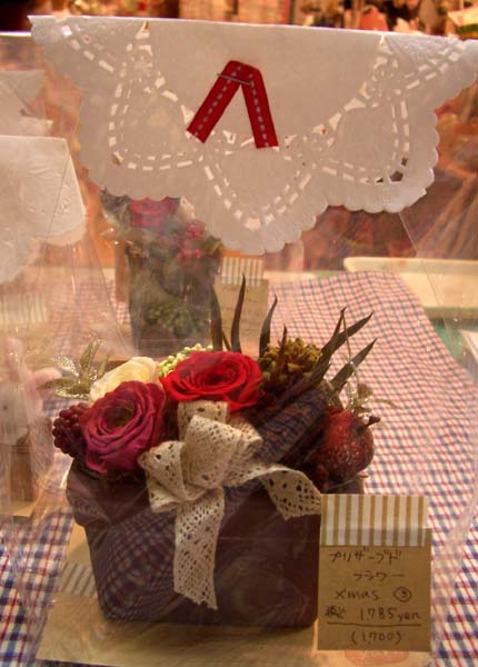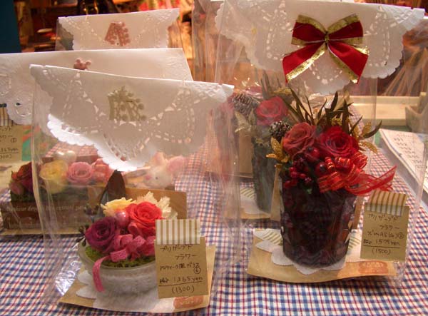 百合ちゃんはブリザーブドフラワーのアレンジを、たくさん納品してくれました。 おしゃれな色遣いにキュートなラッピング、お値段お手頃(¥1365・¥1575・¥1785)で、プレゼントに大人気です。
