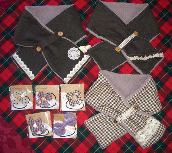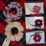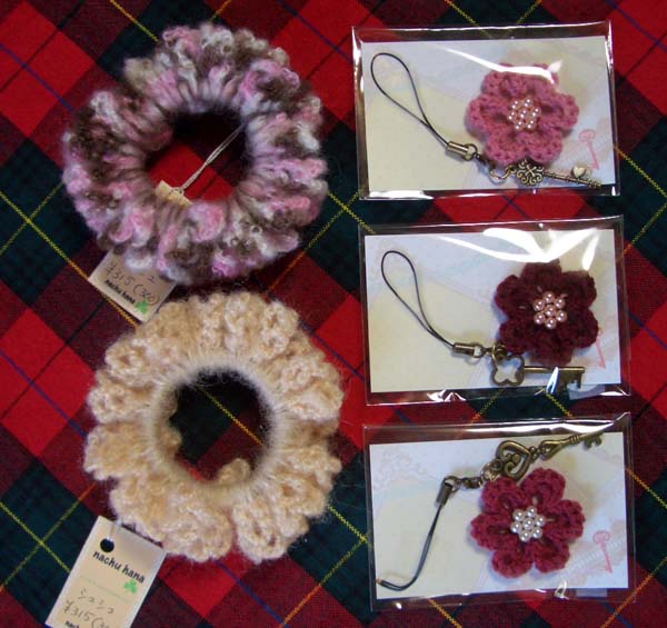 可愛いふわふわでもふもふの「マフラー ¥1050」と、キュートな「りぼんゴム ¥315」を、納品してくれたhappy arrowさん。 とても暖かそう。 なちゅはなさんは、注文のバックを納品。人気のシュシュと花ストラップも、少し編めました。
