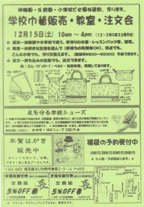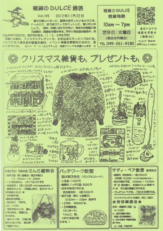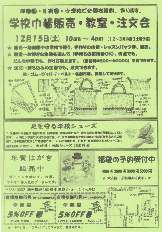 DULCE通信 Vol.199、 出来ました。 「手作り学校巾着教室」 12月15日(土) 10AM~4PM 手作り学校小物、販売、教室、注文受付します。