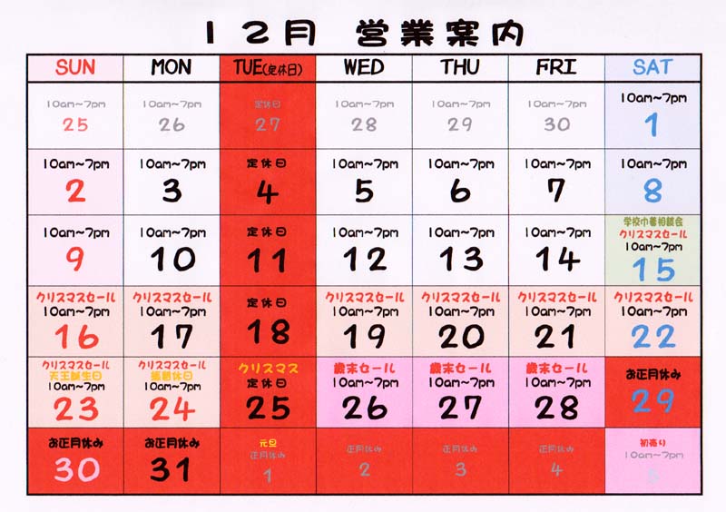 12月の営業案内 定休日 火曜日 12月29日(土)~1月4日(金) お正月休み