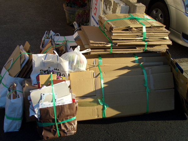 小学校の資源回収の日。 お店の前を回収場所にしてもらい、大きな段ボールを運ばなくて、助かります。 紐をかけて運んで積んで、ひと仕事...┌(´_`)┐